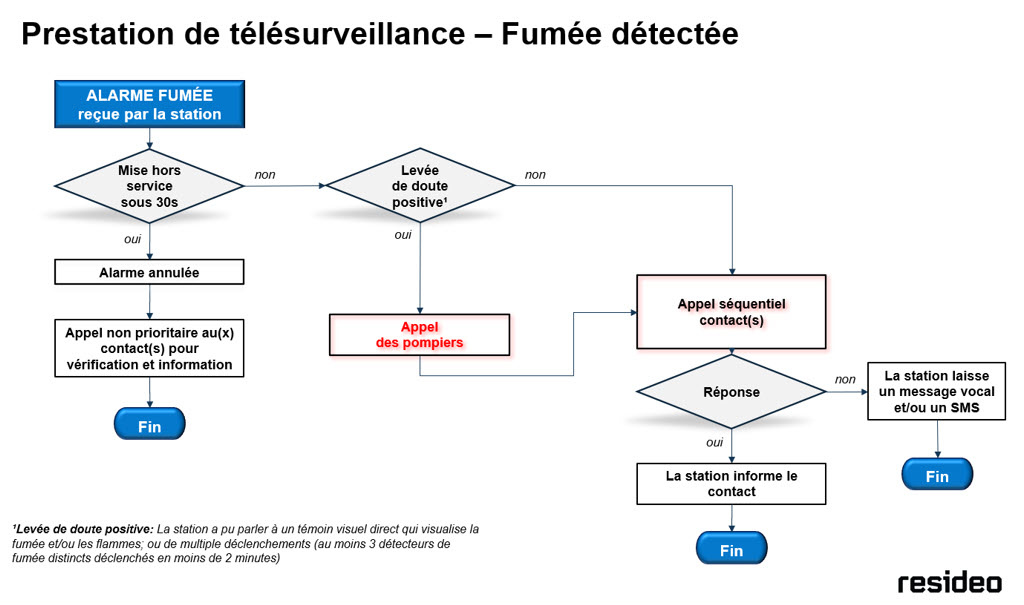 Les détecteurs de fumée sont fonctionnels 24h/24h. Dans tous les cas, que la télésurveillance soit activée ou non, une détection de fumée déclenchera la sirène du détecteur et une notification d'alarme fumée vous sera envoyée. Dans le cas où la télésurveillance est activée, le centre de télésurveillance traitera l'alarme fumée comme décrite dans les consignes.