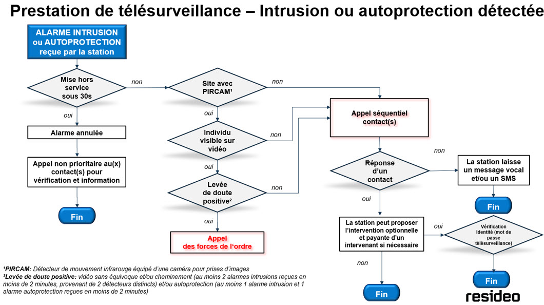 En cas de doute, l'opérateur de télésurveillance pourra proposer l'intervention d'un agent de sécurité à votre domicile (selon les CGS) pour vérifier si une intrusion a eu lieu. En cas d'intrusion avéré, l'opérateur pourra proposer un service de gardiennage forfaitaire selon les CGS en vigueur.